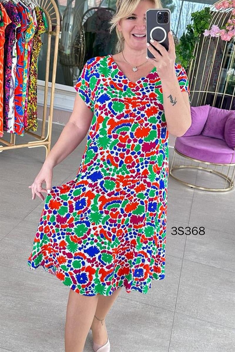 V YAKA DESENLİ VİSKON ELBİSE BOYU DESENE VE BEDENE GÖRE 106 CM 110 CM ARASI DEĞİŞMEKTEDİR