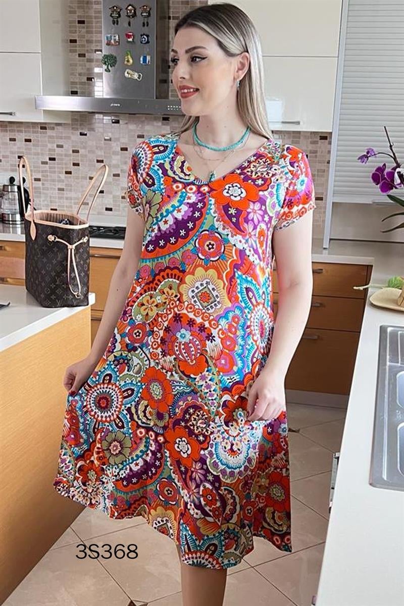 V YAKA DESENLİ VİSKON ELBİSE BOYU DESENE VE BEDENE GÖRE 106 CM 110 CM ARASI DEĞİŞMEKTEDİR