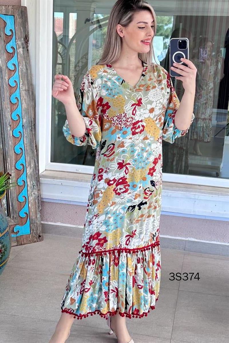 V Yaka Eteği Ponponlu Elbise