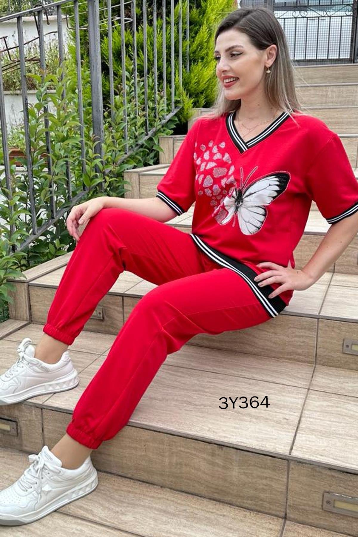 V Yaka Kelebek Taş Baskılı 2 li Eşofman Takımı