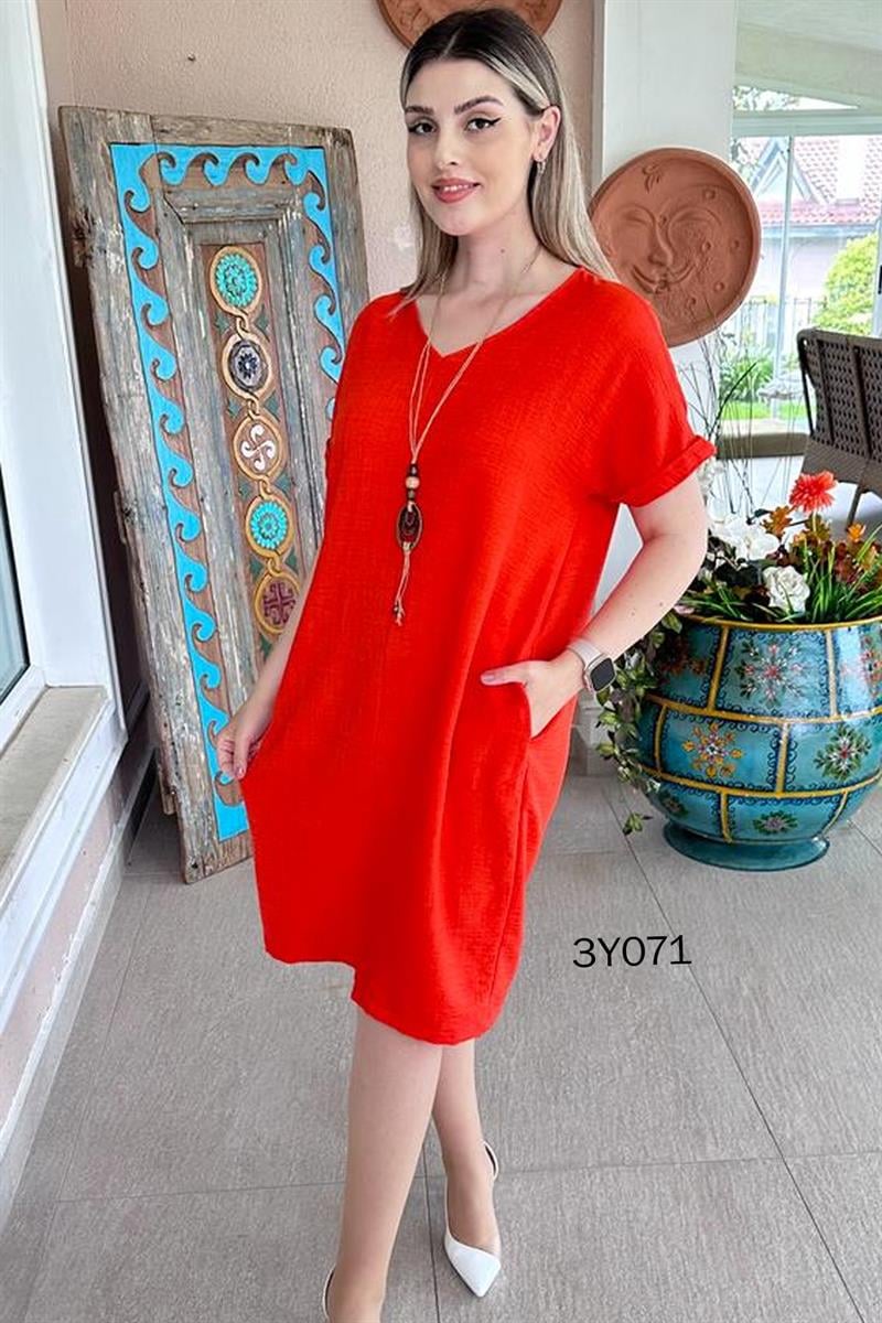V Yaka Keten Aerobin Kolyeli Elbise