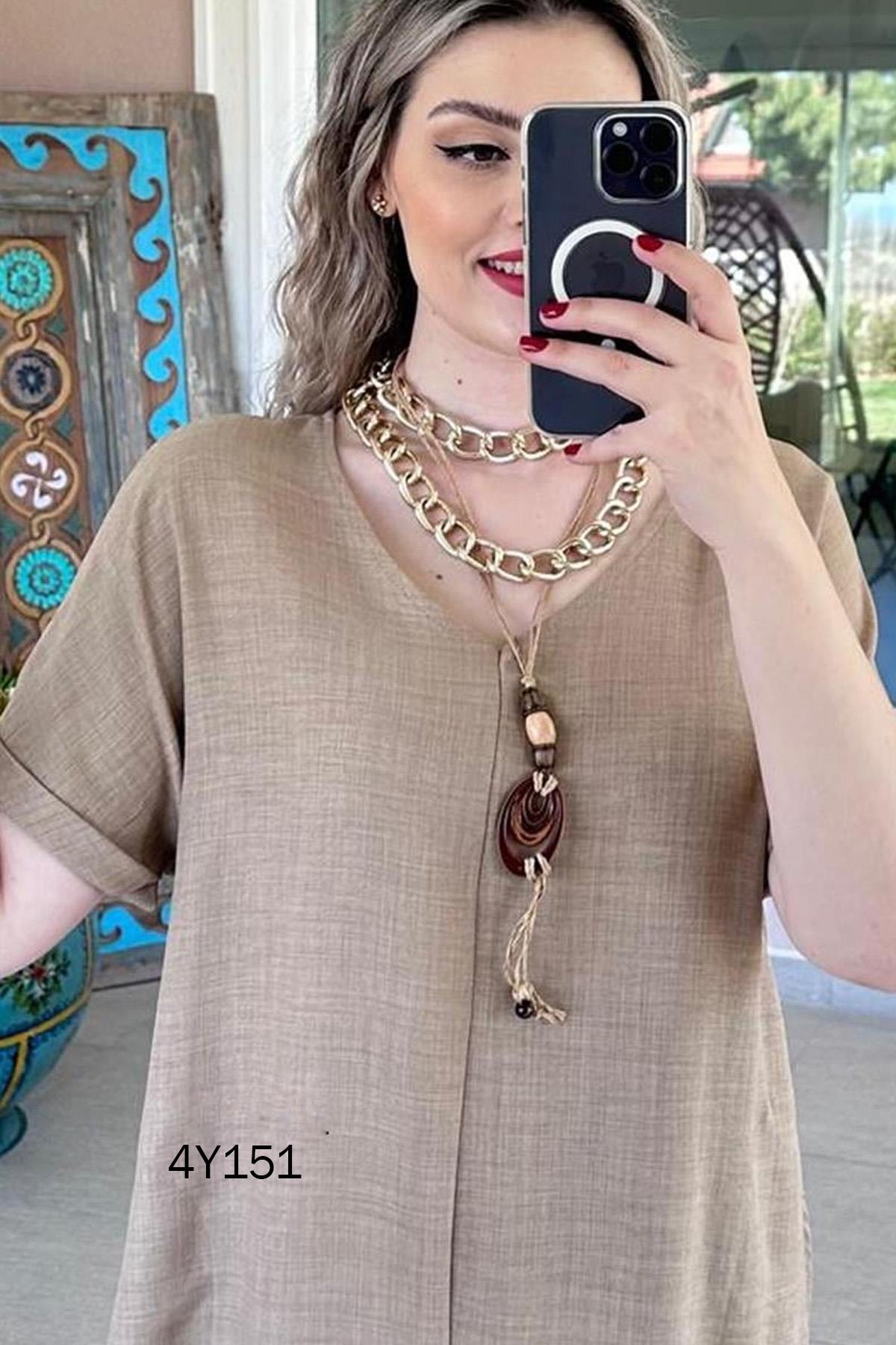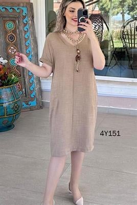 V YAKA KETEN AEROBİN KOLYELİ ELBİSE OMUZDAN AŞAĞI 104 CM