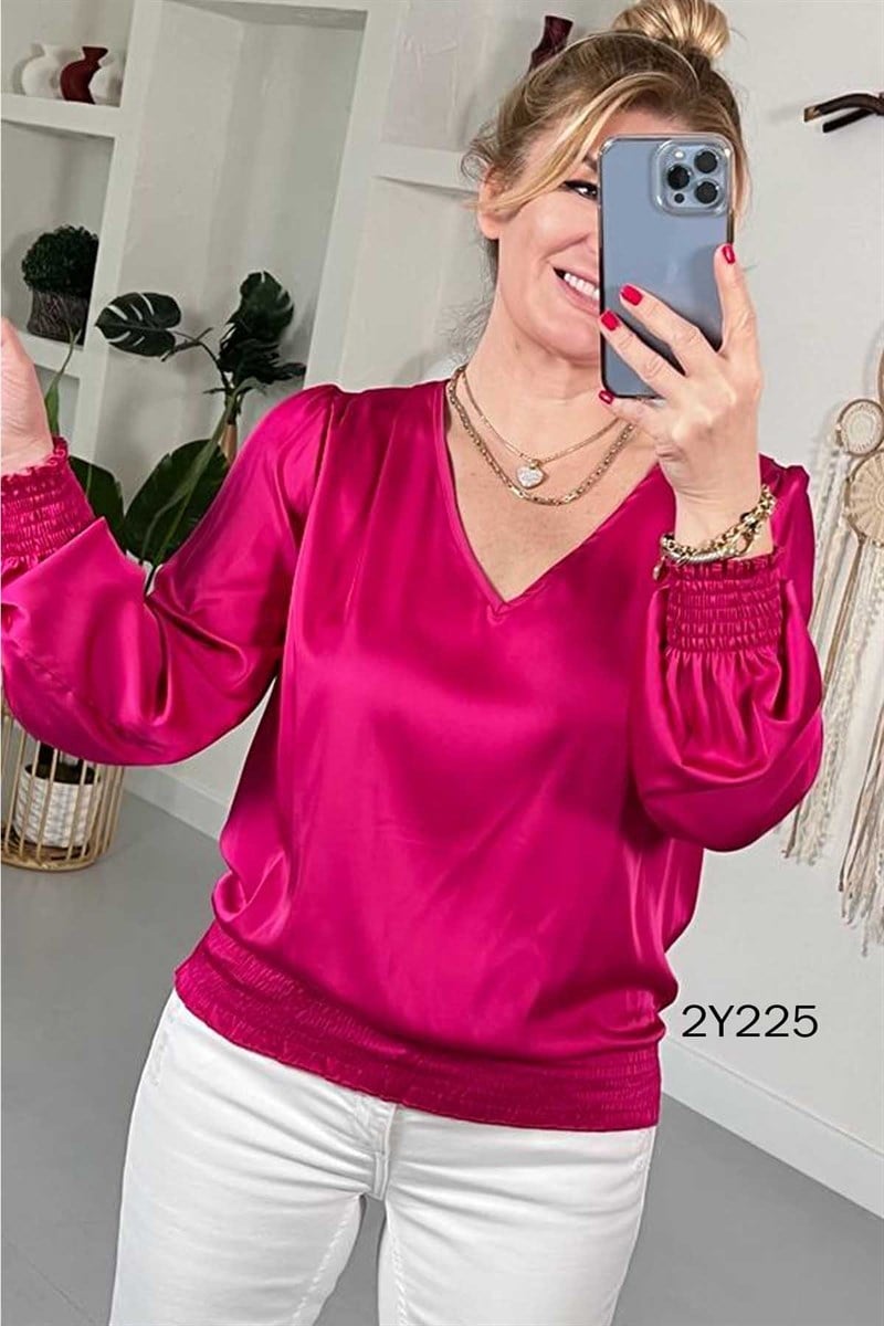 V Yaka Kolları Ve Alt Gipeli Saten Bluz