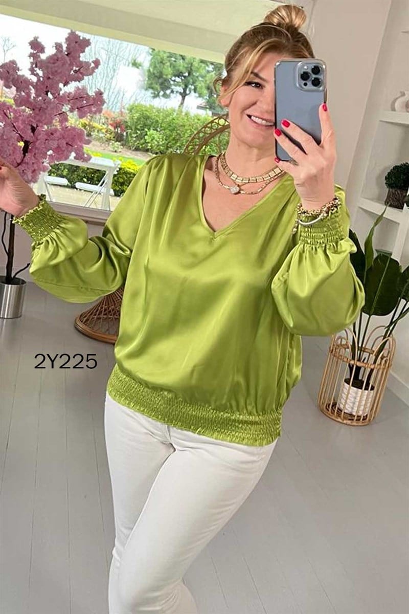 V YAKA KOLLARI VE ALTI GİPELİ SATEN BLUZ OMUZDAN AŞAĞI 62 CM