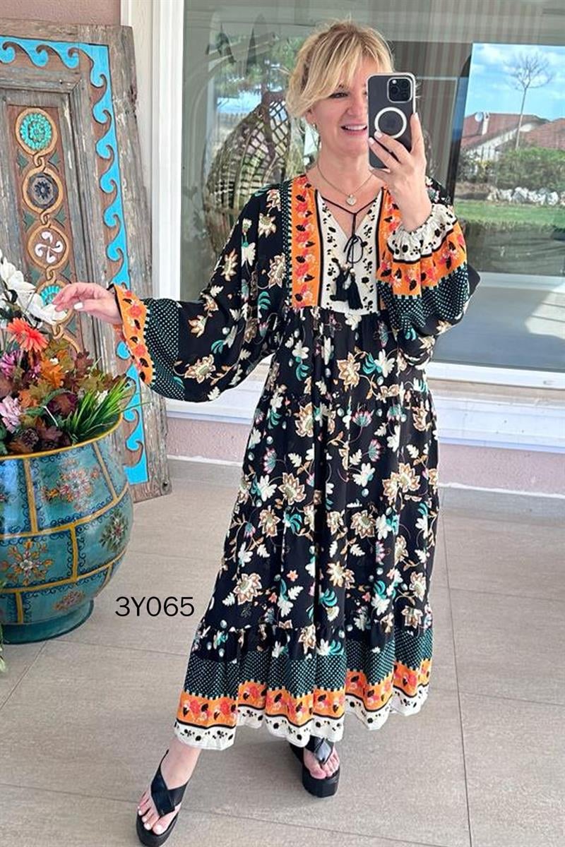 V YAKA PÜSKÜL DETAY VİSKON ELBİSE OMUZDAN AŞAĞI 128 CM