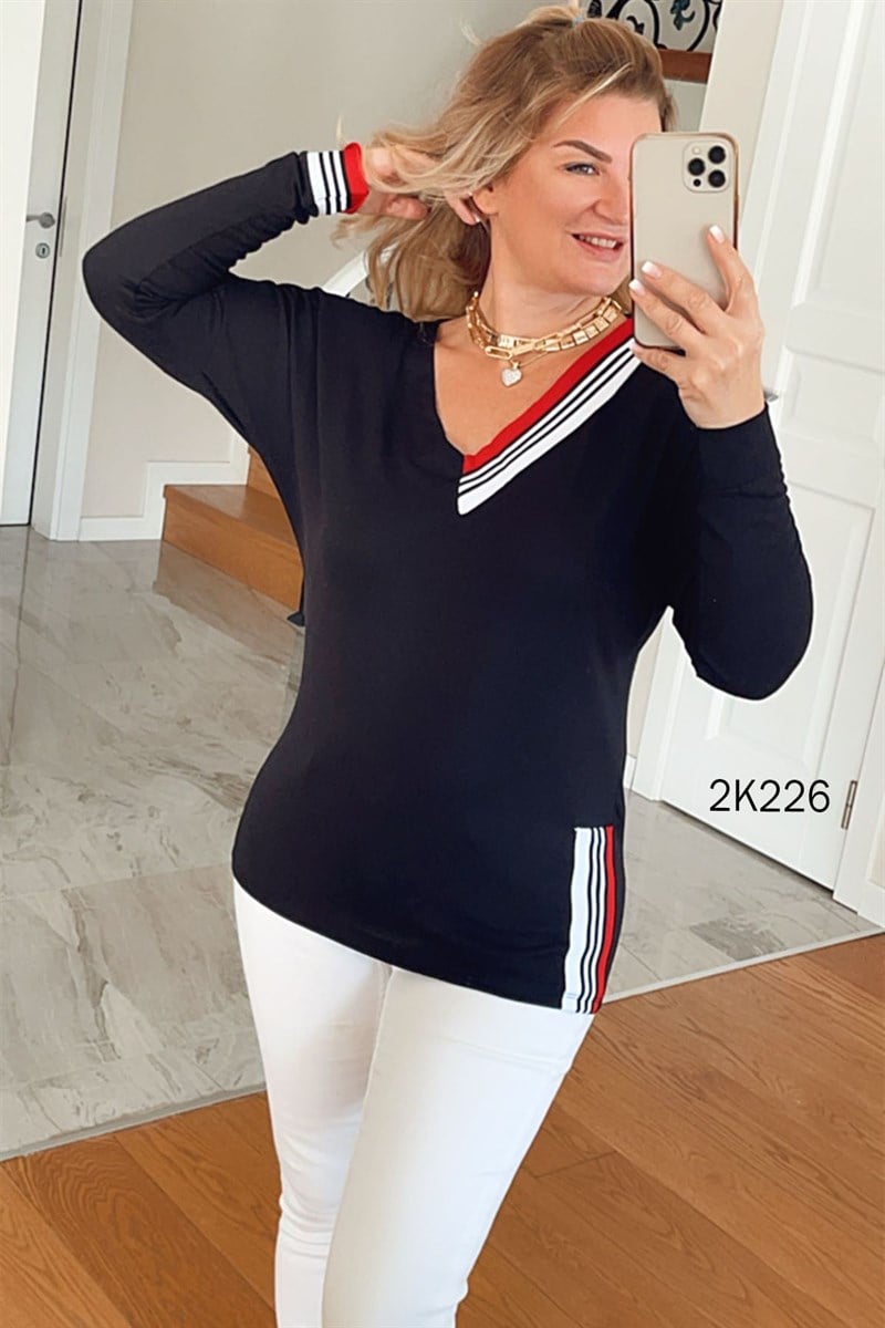 V YAKA ŞERİT DETAY BLUZ OMUZDAN AŞAĞI 66 CM