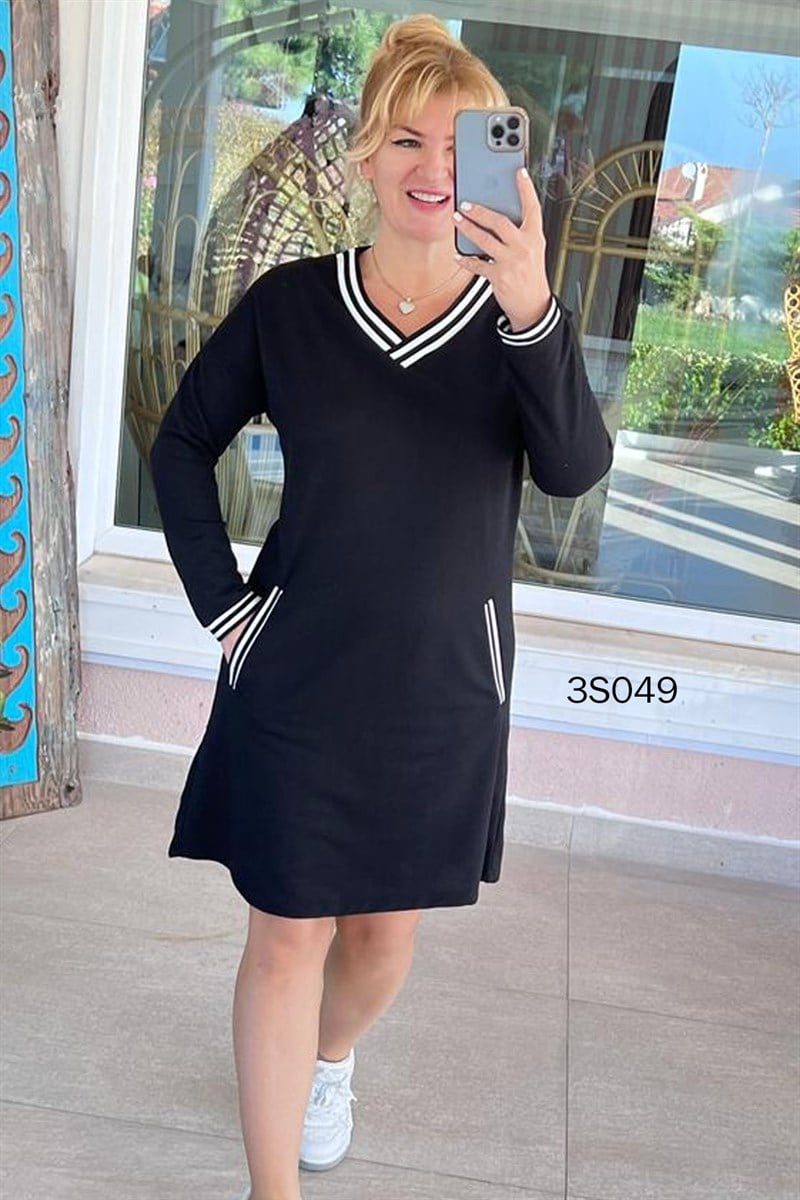 V YAKA İKİ İPLİK ŞERİT DETAY ELBİSE OMUZDAN AŞAĞI BOY 90 VE 93 CM ARASI DEĞİŞMEKTEDİR