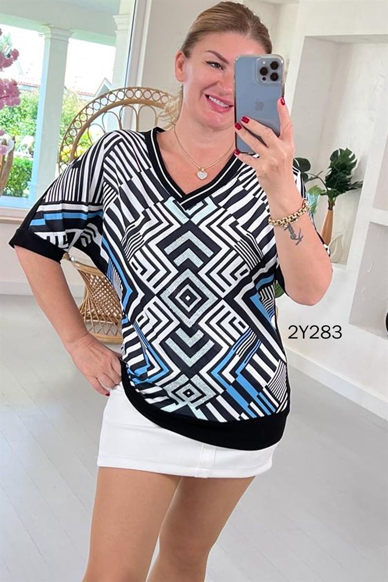 V YAKA TAŞ İŞLEMELİ BLUZ OMUZDAN AŞAĞI 70 CM