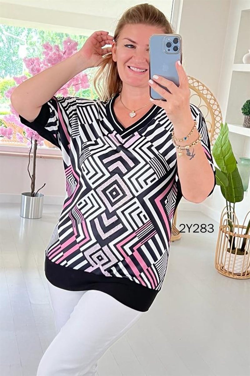 V YAKA TAŞ İŞLEMELİ BLUZ OMUZDAN AŞAĞI 70 CM