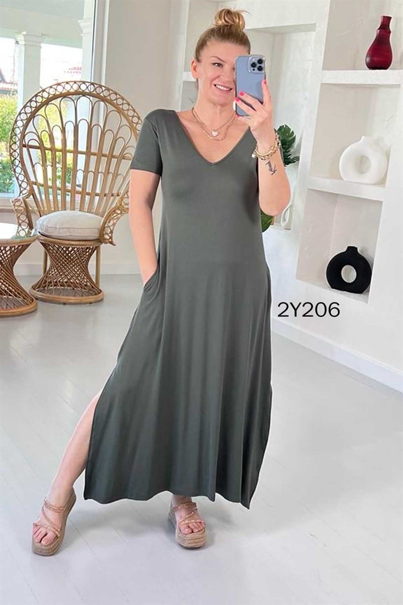 V YAKA YANDAN YIRTMAÇLI ELBİSE OMUZDAN AŞAĞI 130 CM