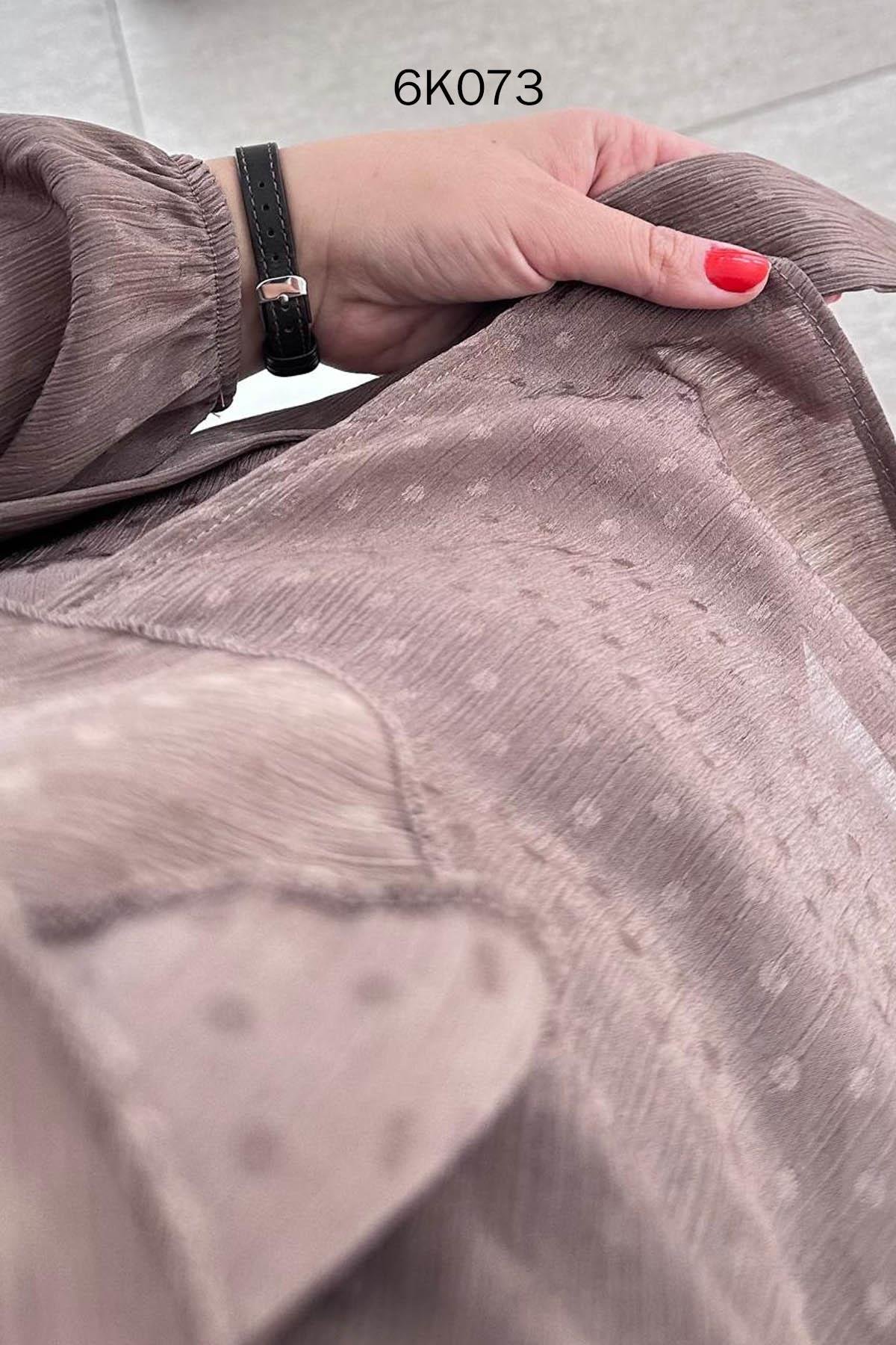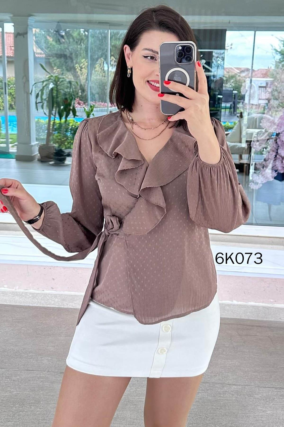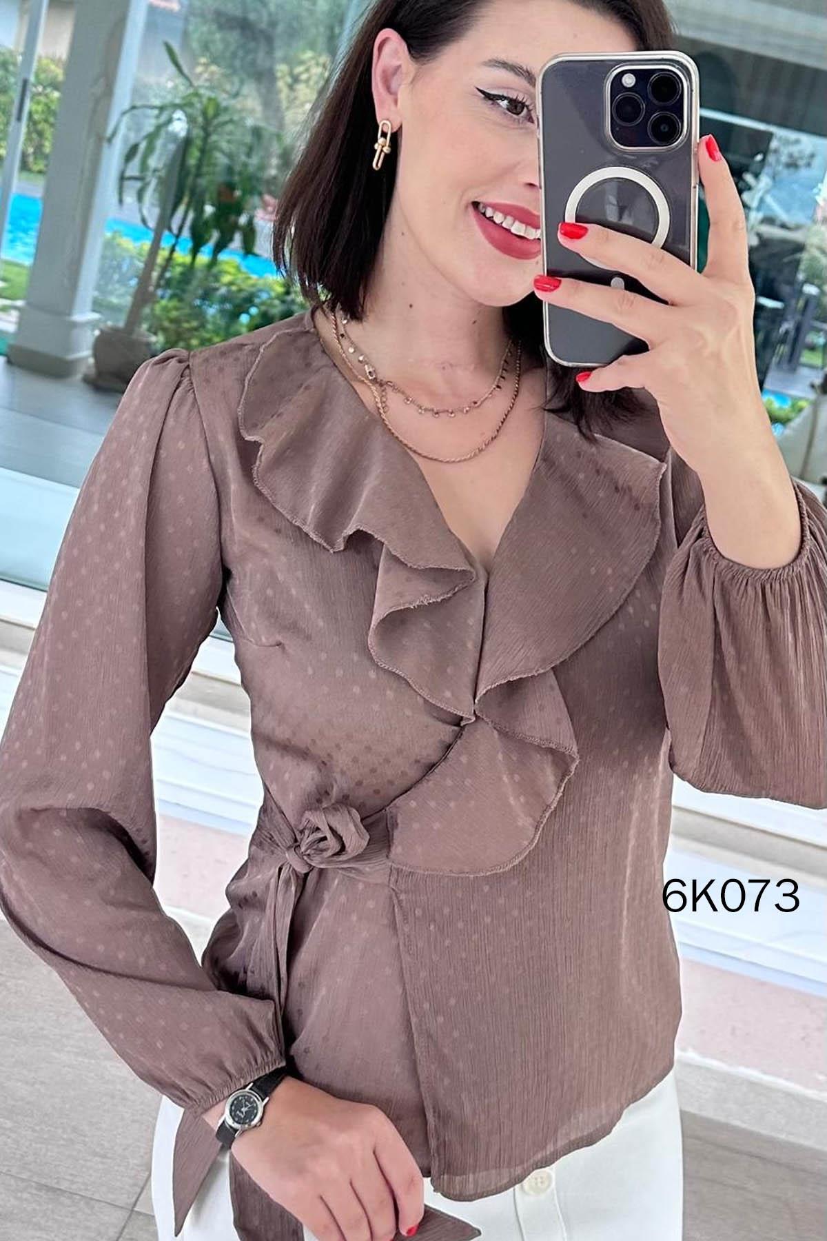 VOLANLI YANDAN BAĞLAMALI YAKARLI SATEN BLUZ OMUZDAN AŞAĞI 65 CM