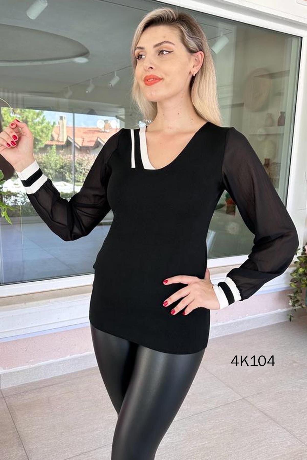 YAKASI ÇİZGİLİ KOLLARI ŞİFON TRİKO BLUZ OMUZDAN AŞAĞI 65 CM