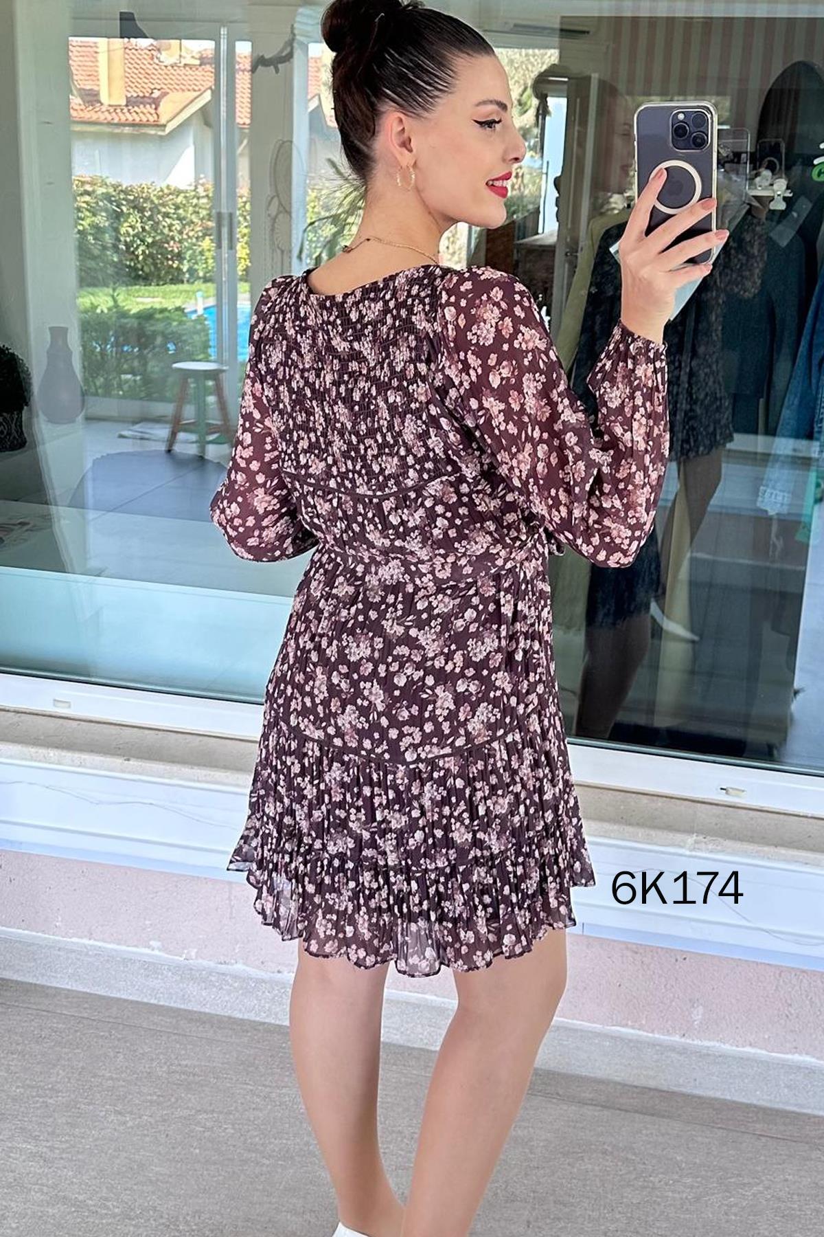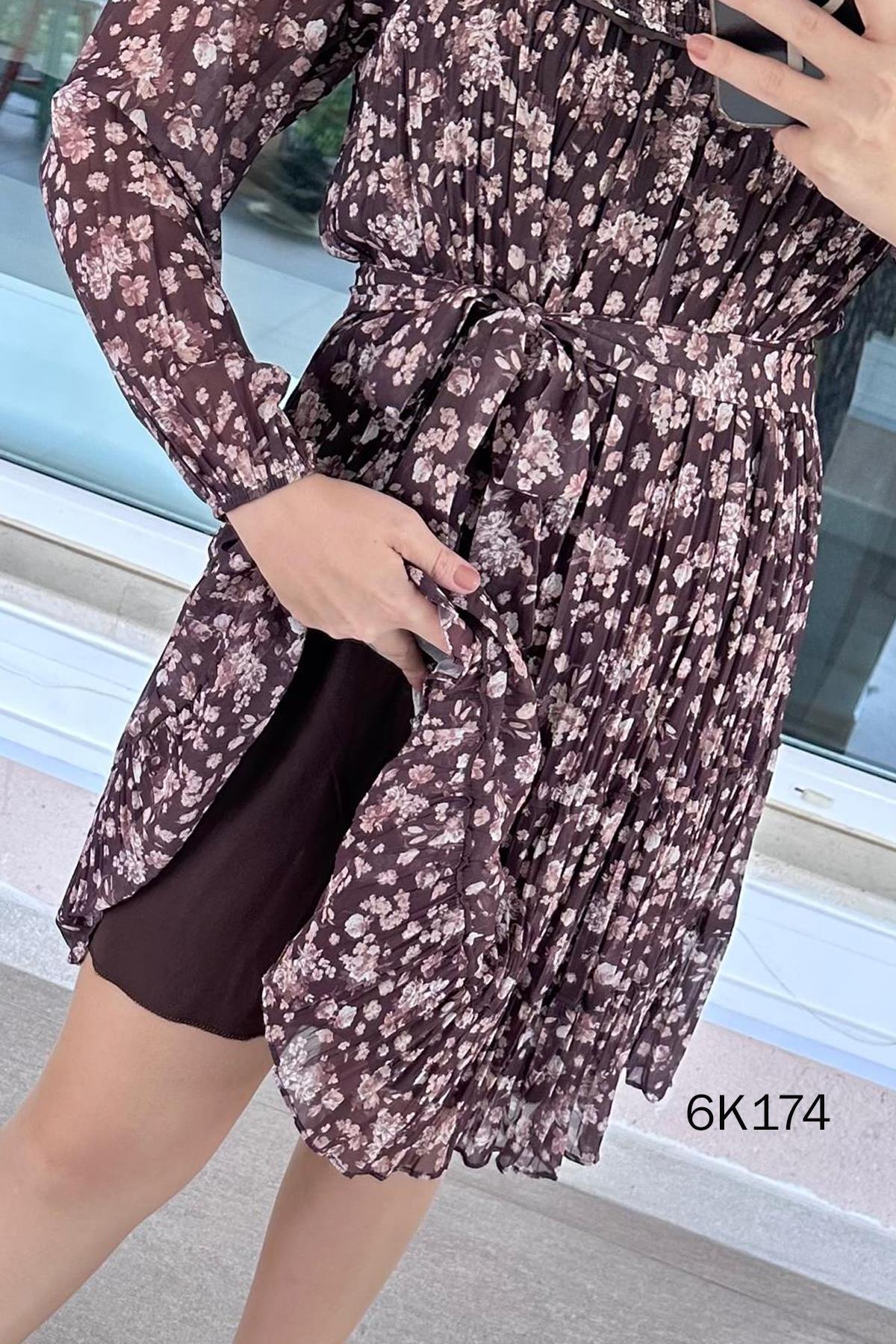 YAKASI GİPELİ ŞİFON DİZ BOY ELBİSE OMUZDAN AŞAĞI 95 CM