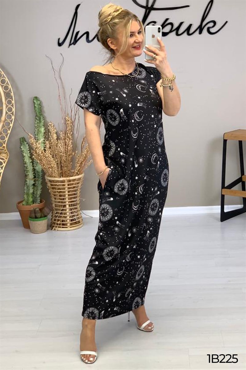 YANDAN CEPLİ LİKRALI DESENLİ ELBİSE OMUZDAN AŞAĞI 135 CM