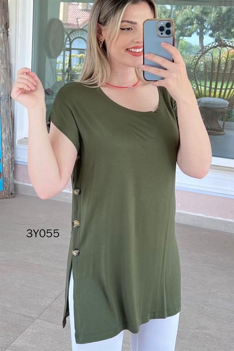 YANDAN DÜĞMELİ LİKRALI BLUZ OMUZDAN AŞAĞI 82 CM