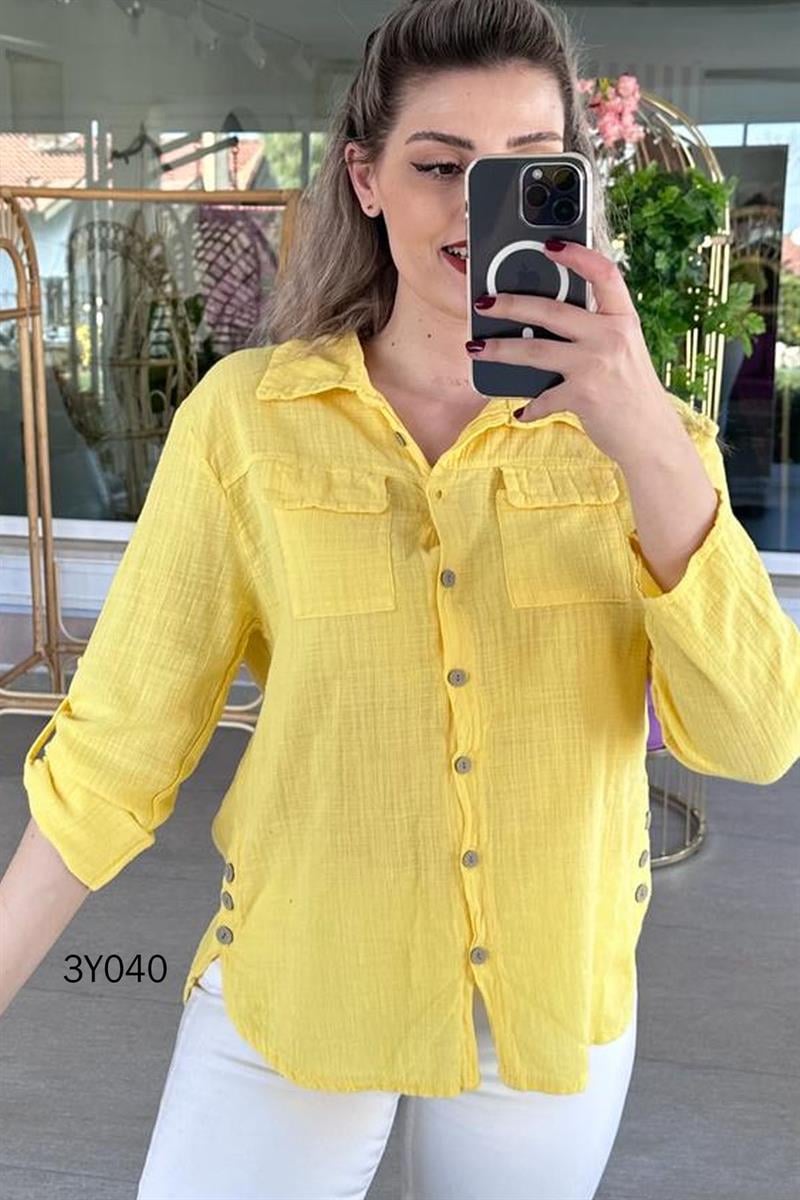 YANI DÜĞMELİ KETEN GÖMLEK OMUZDAN AŞAĞI 67 CM